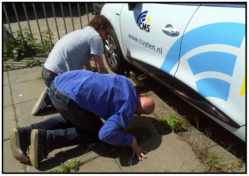Modern cars don’t have spare tires anymore, but they come equipped with a sort of foam that you have to inject in the tire. The foam expands inside the tire and should seal the hole, provided it isn’t too big. But the hole in this tire was way too big, more of a tear than a hole. When we pumped in the foam you heard the hissing sound of the air escaping again. The only thing left to do was to call roadside assistance. They had to go to the depot to get a new tire first, but after 2 hours a new tire was mounted and we were finally on our way back to Edam again.